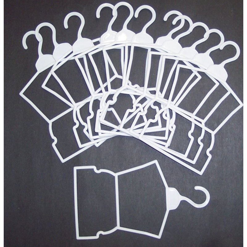 12 White Plastic Outfit Hangers - 1 Dozen Listing is for: 12 white plastic outfit hangers Features: 6" wide 10" long Opening that goes over the rod is 1" wide Will also fit: 15” Doll Clothes Please Note: The items I sell are new manufactured items made to fit 18” Doll Clothes.