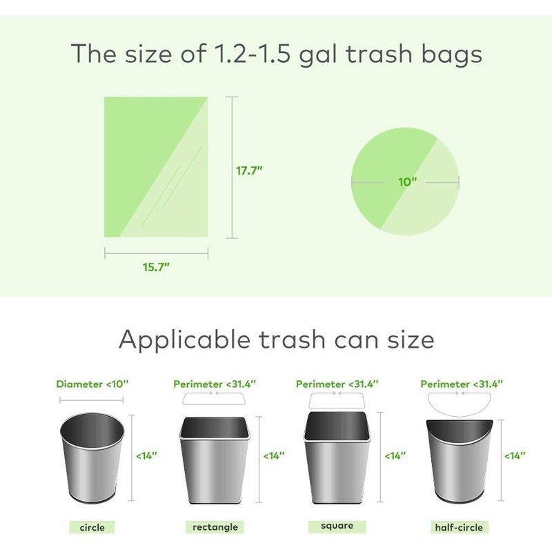 - 【1.2 Gallon Small Trash bags】: 150 counts of 6 rolls. 17.3 inch *15.7 inch, The trash-can-liners fit small size trash-cans. This trash-bin-bags are small but thick, suitable for storing daily garbage.