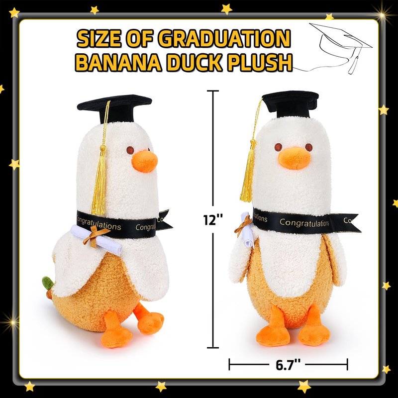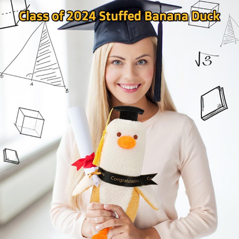 - 👩🎓 【2024 Graduation Gift for Kids & Adults】What events can be more exciting than graduation. Celebrate your kids and friends accomplishment and encourage the journey ahead with this thoughful graduation banana duck plush. This novelty graduation banana duck plush would be a perfect gift to tell the graduates how much you feel proud of them and send congratulations. Whether they are your daughter,sons, friends, sisters, niece, classmates. It's a gift that they will happily use every day.