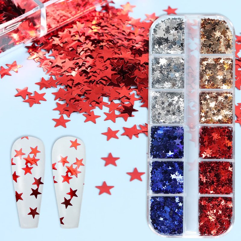12 Grids 4th of July Nail Glitter Sequins 3D Star Nail Art Stickers Decals Holographic Red Blue Sliver Gold Star Nail Glitter Flakes Patriotic Star Glitter Nail Designs for Acrylic Nails Decoration