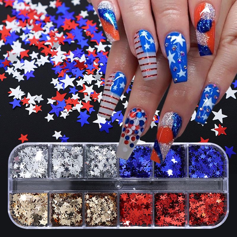 12 Grids 4th of July Star Nail Glitter Sequins Shiny Red Blue Sliver Gold Star Nail Stickers Decals Independence Day Nail Sequins Flakes 3D Glitter Nail Art Supplies for DIY Nail Eye Face Body Decor
