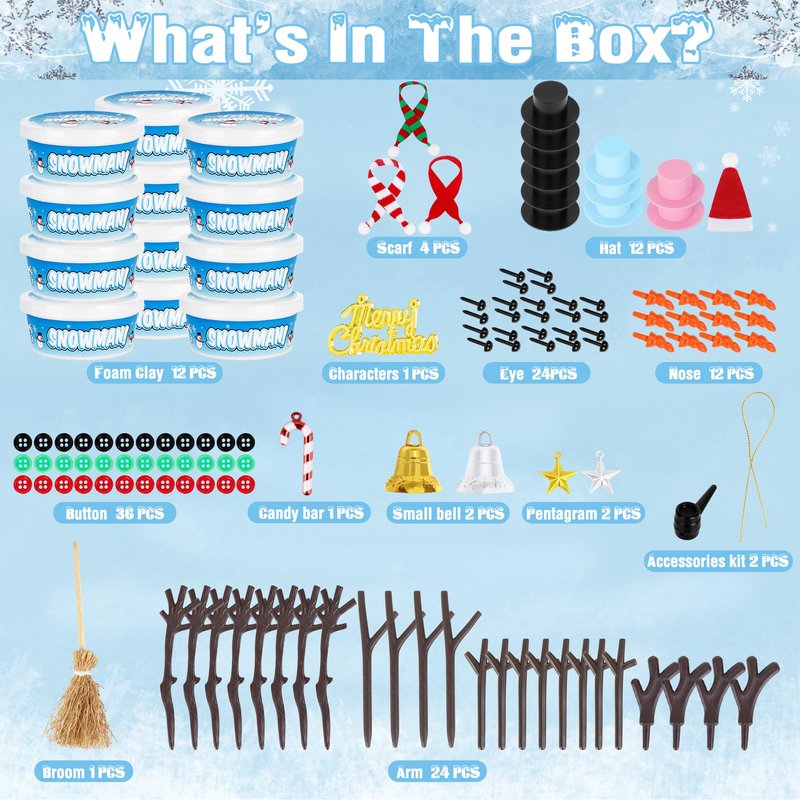 • Package Includes - 12 white clay, 12 hats, 3 scarves, 24 eyes, 12 noses, 24 arms, 36 buttons and 9 snowman accessories. Easy to shape and mold. Enough quantity to build different styles of snowmen.