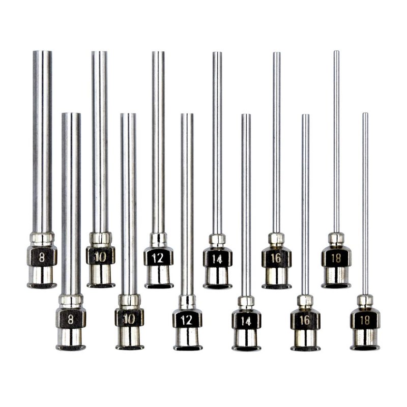 - 12 PCS dispensing needle per box, includes 8G, 10G, 12G, 14G, 16G, 18G 6 Different common size, 2pcs of each Gauge.