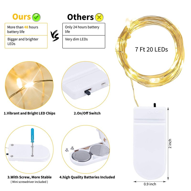 - 【 12 Pack Battery Operated LED Fairy Lights 】- Powered by 2 CR2032 batteries (included), the 7 feet micro fairy light with 20 upgraded energy-efficient LEDs is perfect for both everyday decorations as well as holiday decor. The thin copper wiring and small-sized LED bulbs will add a delicate and cozy touch to your personal space.
