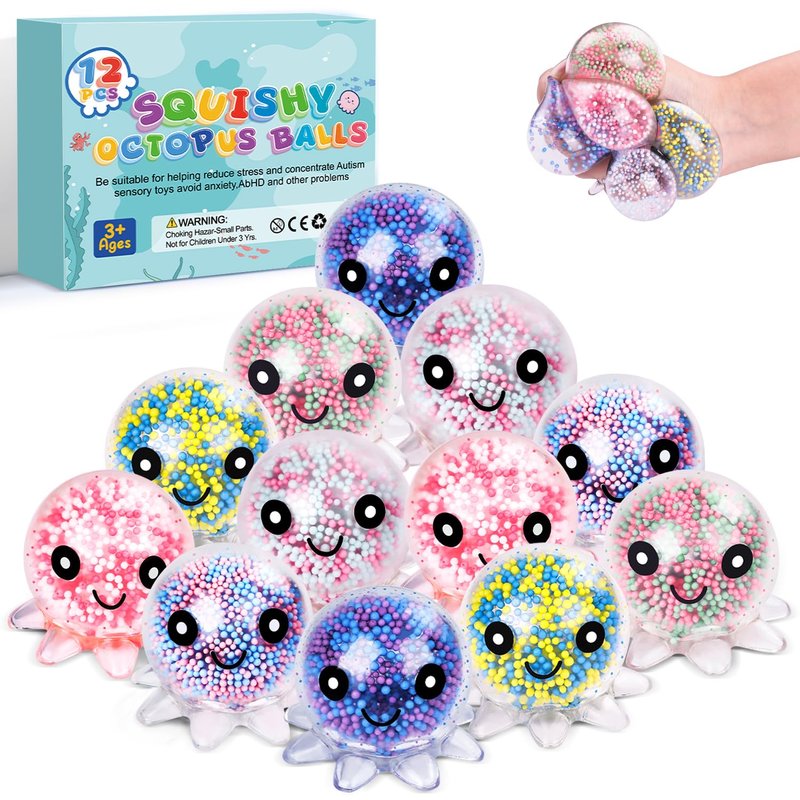 12 Pack Fidget Stress Balls for Adults, Cute Octopus Stress Relief Stress Ball, Bulk Squishy Squeeze Ball Set for Christmas Gifts and Birthday Party Favors