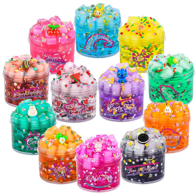 - 12 Pack Clear Slime Kit Jelly Cubes inside - with cute charms, 60ML Each * 12