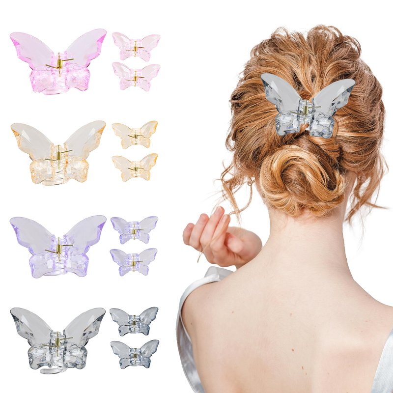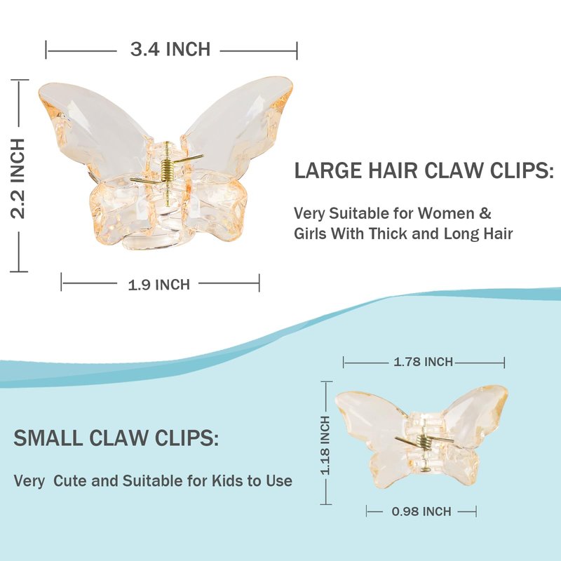 • ❤【Package Included】-You can get 12 clear butterfly hair clips in 2 size and 4 different colors which is purple,pink,gray,champagne. It's a good chioce to decorate and match with jeans,suits,skirts and other different styles of clothes. The hair claw clips is packed in a exquisite pink gift box, they are wrapped with double-layer package protection to make sure hair clips' safety during delivery.