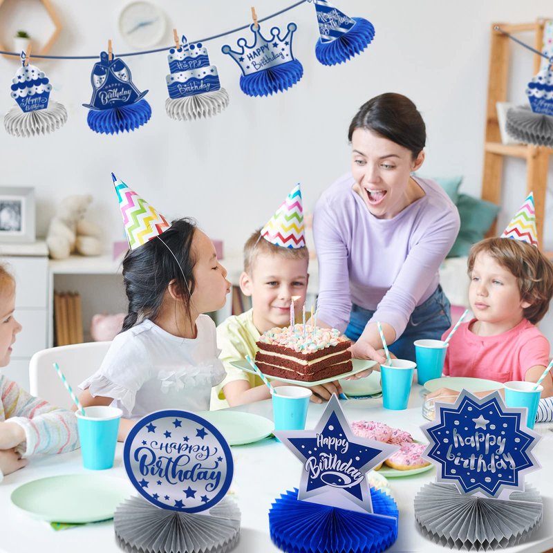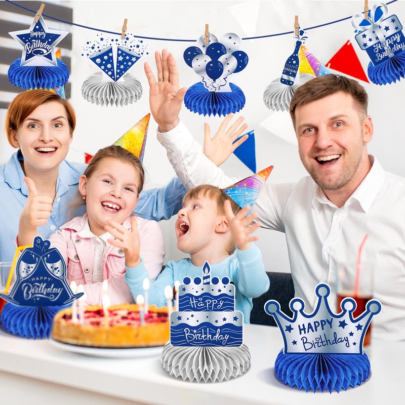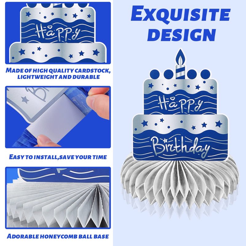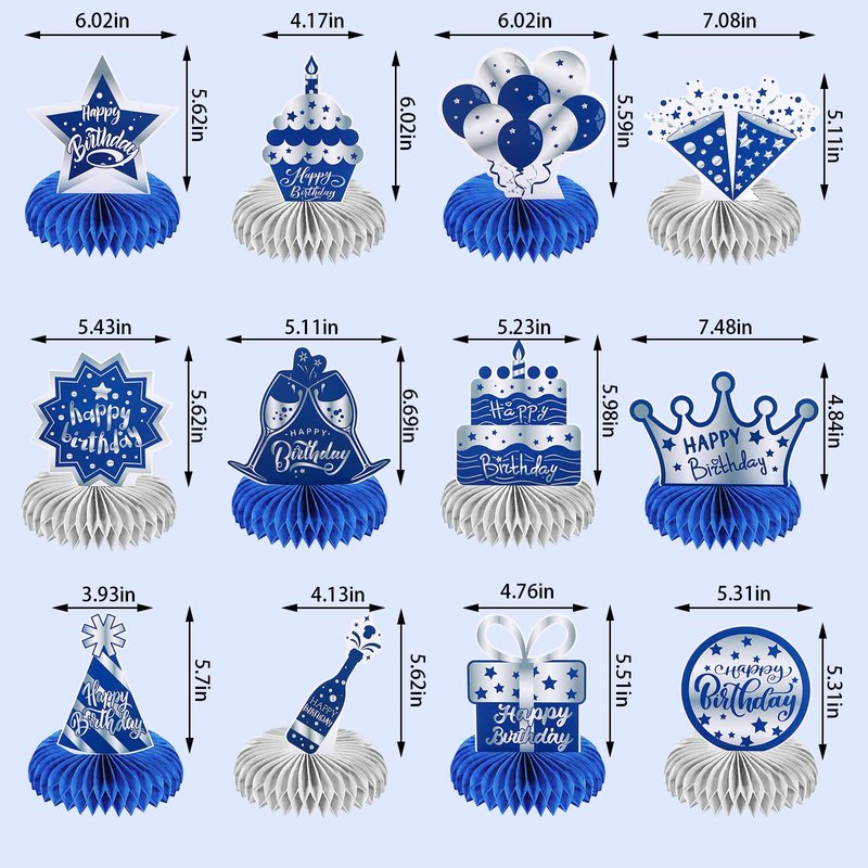 - Exquisite and Eye Catching Design: adopting blue and silver color matching, and also adding rich birthday theme party elements, such as balloons, cakes, gifts, wine glasses, crowns, red wine, etc., these birthday centerpieces for tables make your party more different and create a lively and joyful party atmosphere
