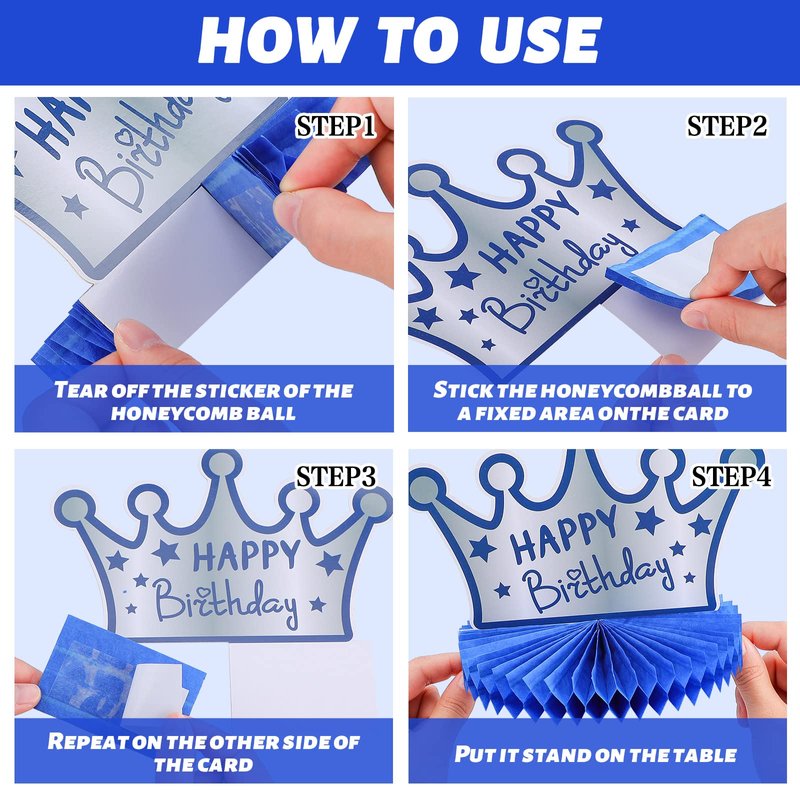 - Simple to Assemble: this honeycomb decor is very to assemble; Step 1, tear off the sticker of the honeycomb ball; Step 2, glue the honeycomb ball to the fixed area on the card; Step 3, repeat on the other side of the card; Step 4 and finally put it on the table