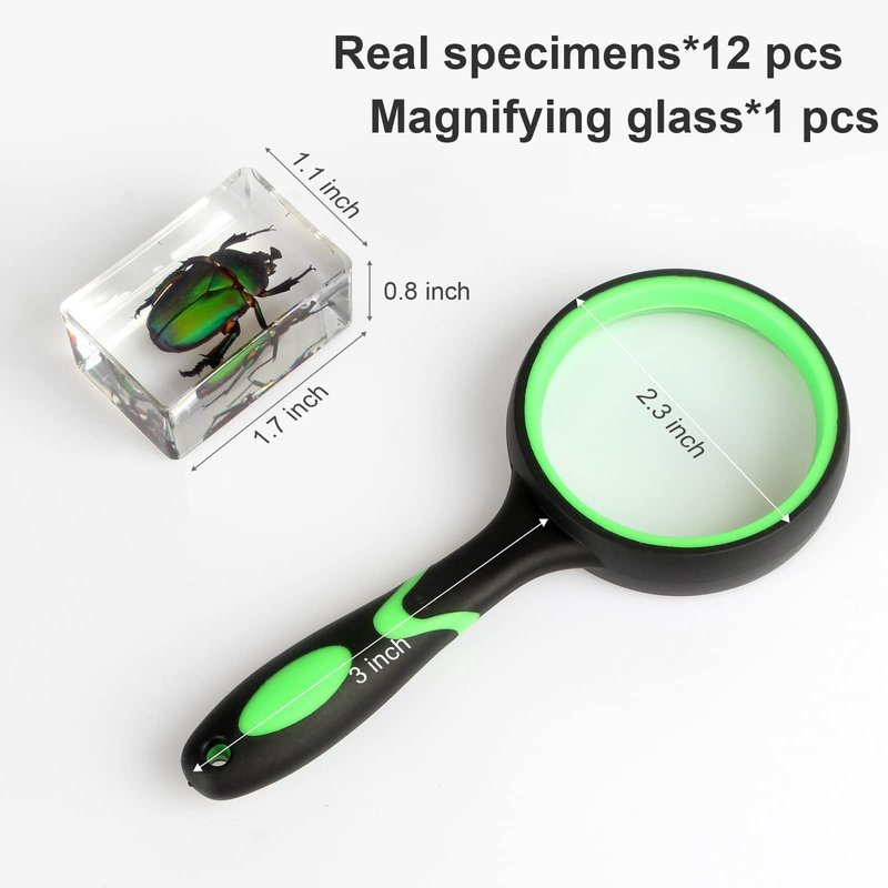 - 【Exquisite Specimen Set】: The package contains 12 pieces exquisite insect specimens and one 5x magnifying glass for viewing. You can view 12 different insect forms and details at 5x magnification.