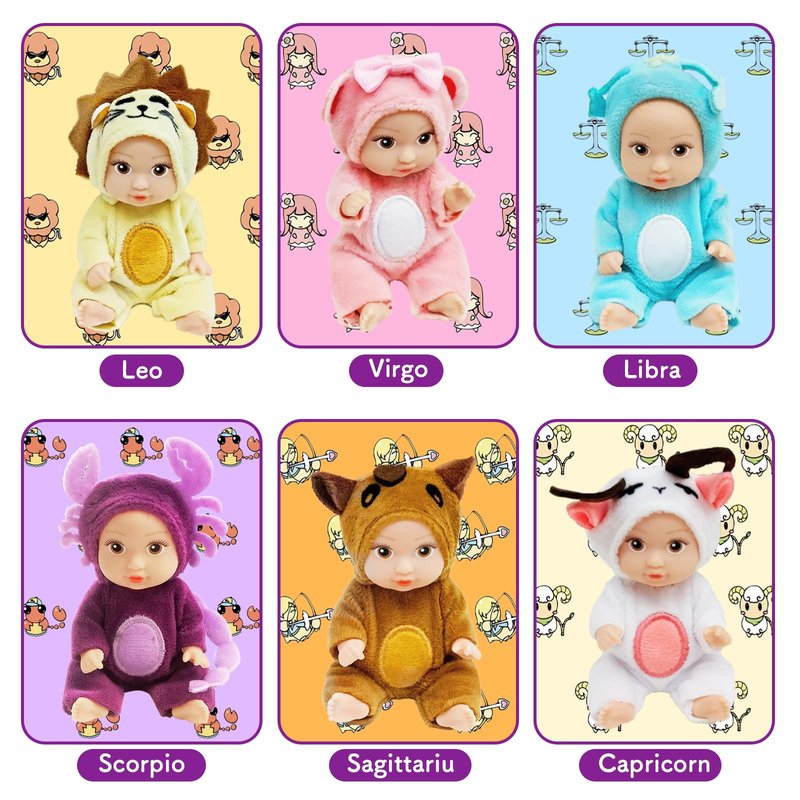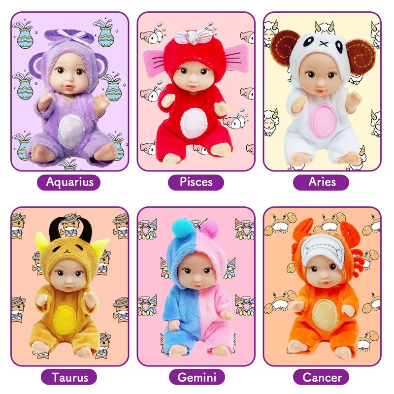 - Lifelike Mini Dolls: A set of 12 4-inch mini dolls, each doll is wearing cute zodiac-shaped clothes, including Aries, Taurus, Gemini, Cancer, Leo, Virgo, Libra, Scorpio, Sagittarius, Capricorn, Aquarius, Pisces.