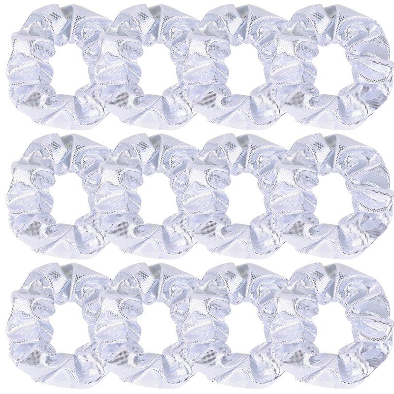 12 Pcs Shiny Metallic Cheer Dance Hair Scrunchies For Thick Hair School Performance/Sports/Practice/Party/Gymnastics Scrunchie Ponytail Holder Wrist for Girls Cosplay Show (White)