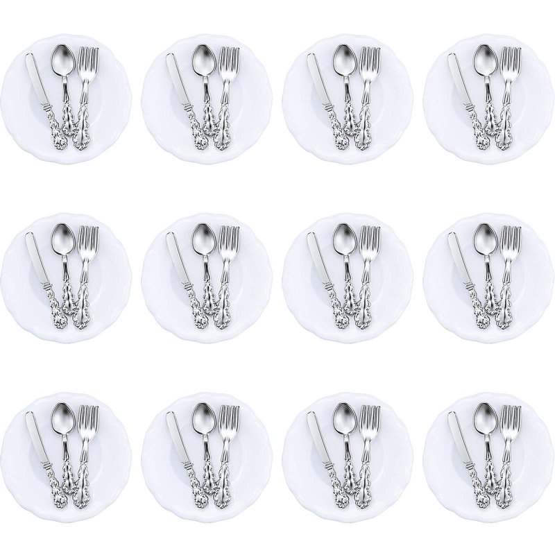 12 Pieces 1:12 Scale Miniature Plates and 12 Pieces Knives Forks Spoons Metal Tableware Dollhouse Miniatures Porcelain Plate Set Dollhouse Kitchen Accessories Dollhouse Decoration Accessories