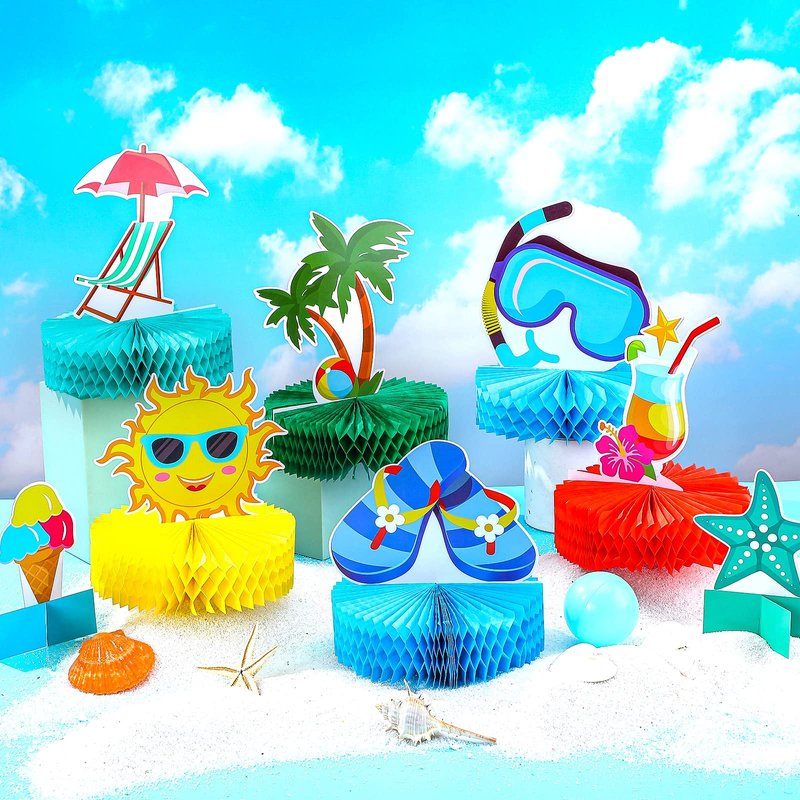 - Easy to Assemble: it only takes a few minutes to assemble these beach honeycomb centerpieces; You just peel off the stickers and stick them on the card, unfold the bottom of the middle section, and you will have a set of fun beach decoration