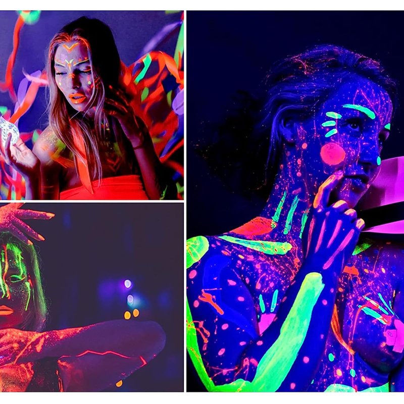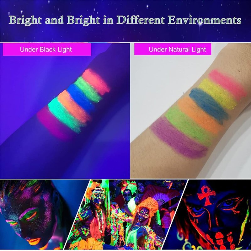 - Glow in the dark under UV Black Light: During the day time , our face paint are bright and neon. Our face paint does not glow in the dark directly unless under UV blacklights.