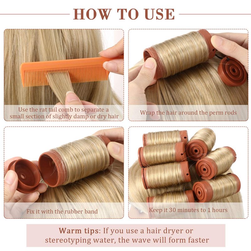 - Save your efforts: just use the pintail comb to separate a small strand of wet hair, wrap it on the rods, then use rubber band to fix it, no need heating, so it won't hurt your hair, wait for a while and you can get a charming curly hair, you can also adjust the direction when rolling your hair on the rods and you can create various styles of hair waves