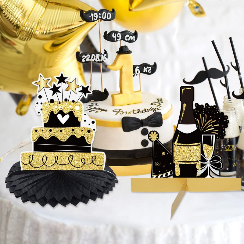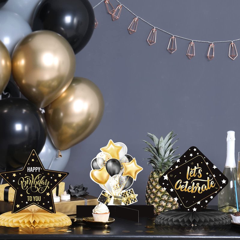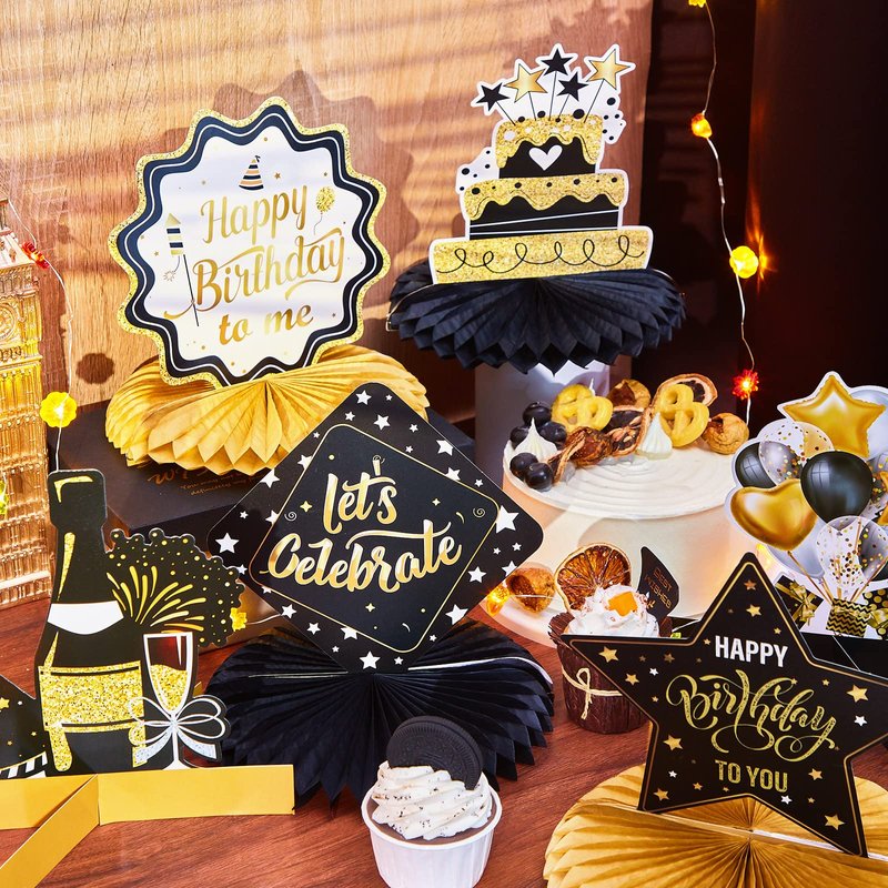 12 Pieces Happy Birthday Decorations Birthday Honeycomb Centerpieces for Table Decorations Birthday Honeycomb Table Topper for Women Men Birthday Theme Party Supplies (Gold, Black)