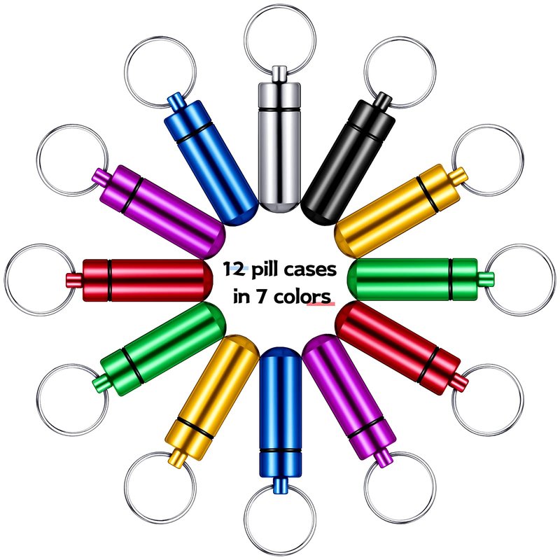 12 Pieces Portable Pill Case First Aid Pill Container Mini Pill Container Waterproof Aluminum Keychain Pill Case Keychain for Medications, Vitamins and Supplements (Colorful)