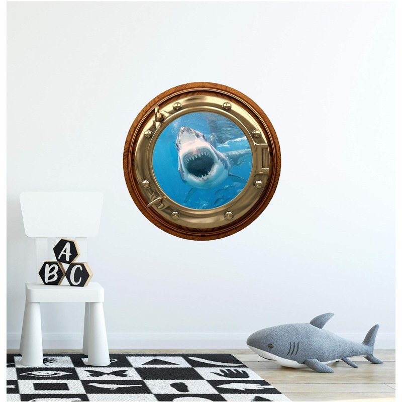 12" Port Scape Instant 3D Window Wall Sticker Great White Shark Attack BRASSWOOD Porthole Wall Decal Ocean Under Water Sea Life Fish Kids Bedroom Playroom Wall Art Room Decor Removable Fabric Vinyl