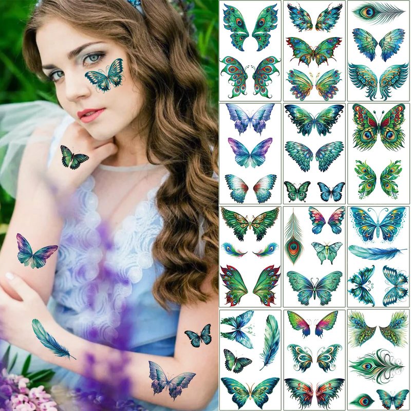 12 Sheets Butterfly Temporary Tattoos Sticker Green Peacock Wings Feather Pattern Waterproof Decal Women Face Eye Makeup Art Party Supplies