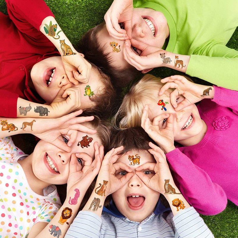 - Widely Used: These jungle theme party favors stickers are perfect for kids party supplies, birthday party favors, carnival prizes, party decorations, goodie bag fillers, pinata, games, Christmas gifts for kids and so on. Kids could do it themselves to paste these temp tattoos on skin. Also suitable for other dry surface such as bottle, toys, birthday goodie bags and so on.