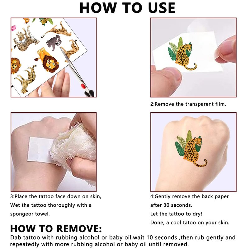 - Easy To Apply And Remove: Cut out the pattern you choose then Just place face down on skin and dampen with water. Hold it down for about 15-30 seconds and remove it. These zoo animals party favors tattoos stickers typically last about 3-6 days. Can be removed with oil, makeup remover, or by scrubbing off. Safe to wear at the beach or in the shower or pool.