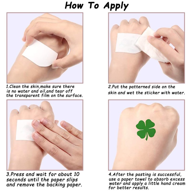 - Easy to use: Just remove the protective film from the Irish temporary tattoos, apply it to the clean skin, wet the towel with water and gently rub it twice, then wait 10-20 seconds, gently tear off the paper, you will get a clover tattoos.