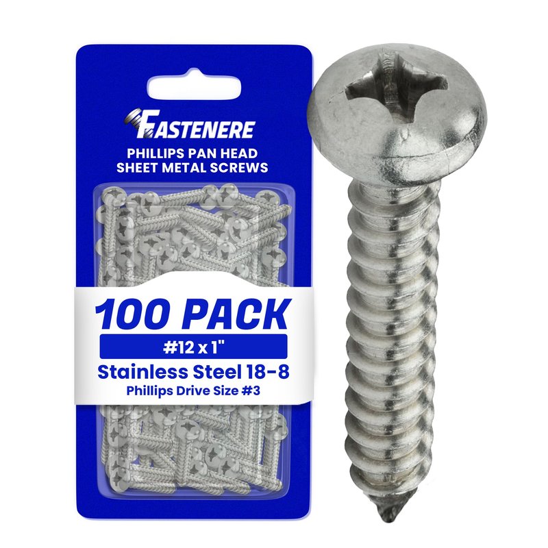 #12 x 1" Pan Head Sheet Metal Screws, Full Thread, Phillips Drive, Stainless Steel 18-8, Bright Finish, Self-Tapping, Quantity 100 Pieces by Fastenere