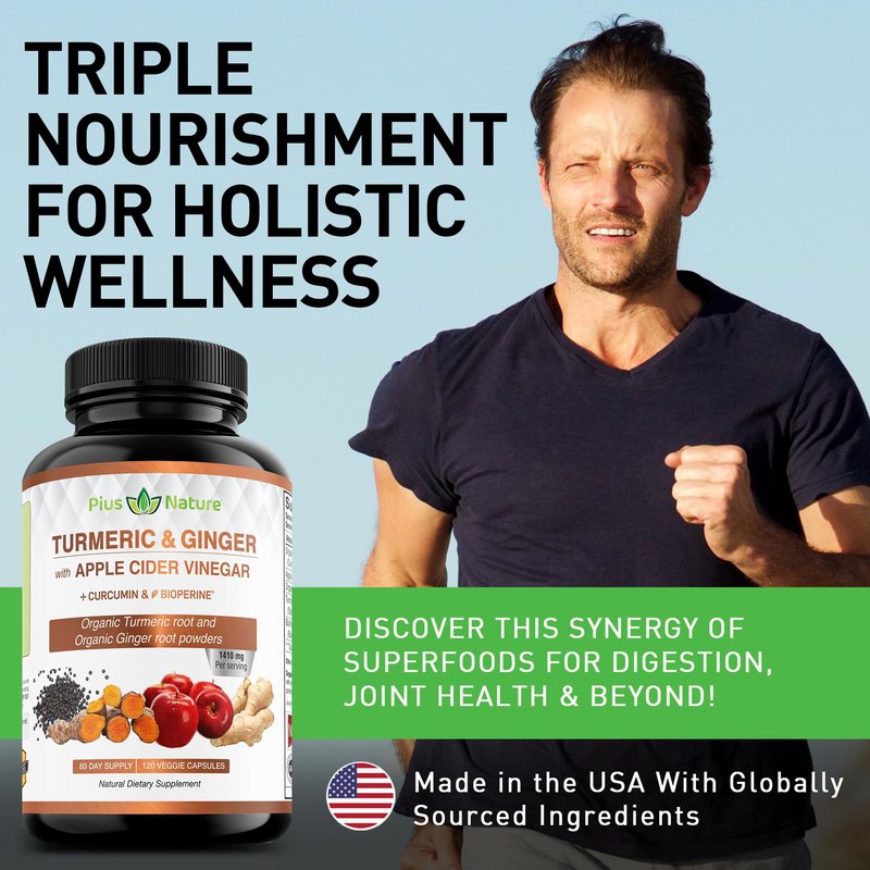 - POWERFUL COMBINATION OF THREE SUPERFOODS: Each capsule contains three superfoods Turmeric, Ginger and Apple Cider Vinegar. To this potent combination we have added Bioprene (black pepper extract) to aid in better absorption of Turmeric. This blend is turbo charged with Curcumin (standardized to 95% Curcuminoids) to boot the benefits of Turmeric.