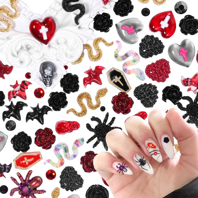 - Exquisite Design: Halloween-themed Gothic nail art rhinestones, including red&black flowers, bats, coffins, spiders, love hearts in various shapes, colorful snakes and flatback pearls nail charms add a lovely breath to the original retro style