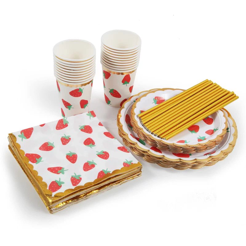 - 【Strawberry Disposable Tableware Set】: Total 120 piece, includes 20 * 9” dinner plates, 20 * 7” dessert plates, 20* 9.5 oz paper cups, 20 * Straws and 40 * Napkins enough for 20 guests.