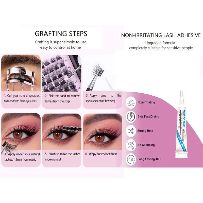 - 【DIY-Friendly】There are two tips that you may pay attention to. first, clean your nature eyelash befour application. second, carefully avoid the glue touching your skin, at leat i-2mm from your eyelash base. with our intruction, you will find it very easy to apply, these clusters make it simple to achieve professional-looking results at home rather than at salon. Experiment with cat eye lashes, manga lashes, fox lashes, baby doll lashes. The possibilities are limitless!