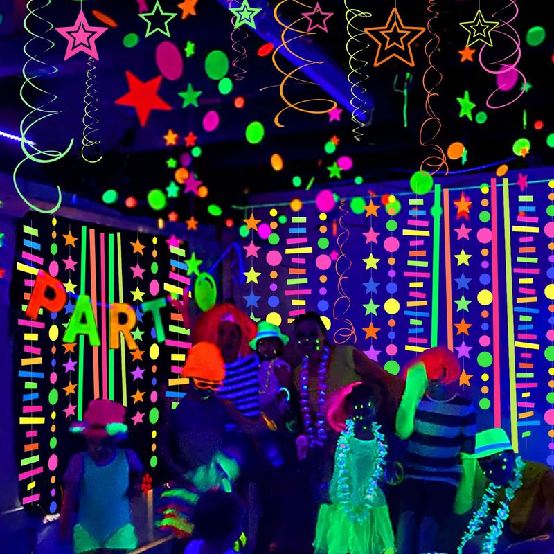 - 【All Occasions Application】Our neon party Supplies perfect for blacklight dark glow party decorations,birthday party,graduation,anniversary,festival celebrations,Christmas, baby showers, school activities.These can be applied for hanging over the ceiling,window sill, fireplace, and garden fences.