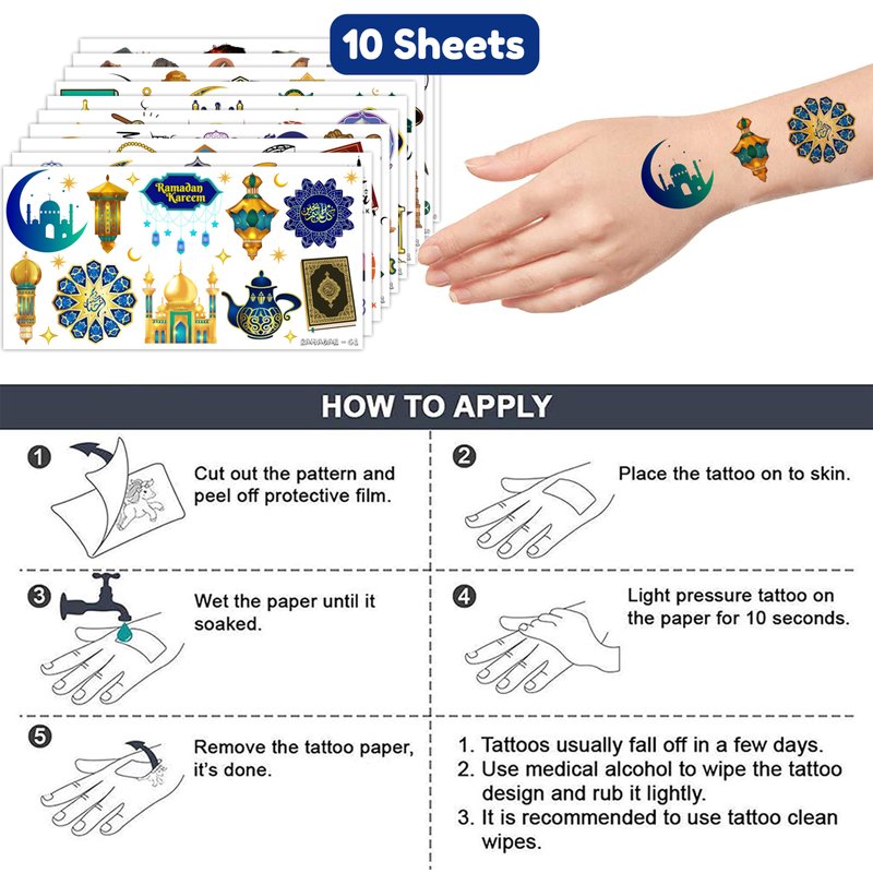 - š ćPERFECT TATTOOS FOR THEMED RAMADANć: Ramadan Tattoos - A Festive Addition for Holiday Fun! Featuring 10 sheets with 100PCS of vibrant Ramadan designs, our collection is a must-have for enthusiasts of all ages celebrating this special occasion. Each sheet measures 6.1 * 3.1 inches, perfect for applying on your body or other smooth objects like glass, stationery, paper, crafts, cups, cabinets, bottles, and clothing.