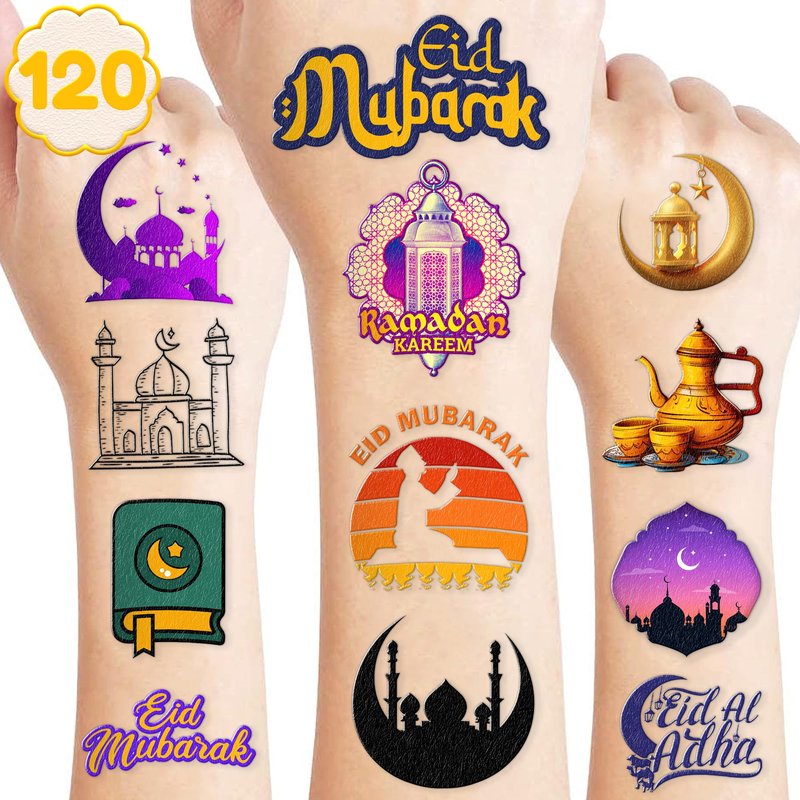 120PCS Eid Al Adha Ramadan Mubarak Temporary Tattoos Happy Ramadan Kareem Sticker for Kids Birthday Decorations Moon Star Tattoos Themed Party Favors and Supplies Cute Kids Boy Gifts Ideal Prizes