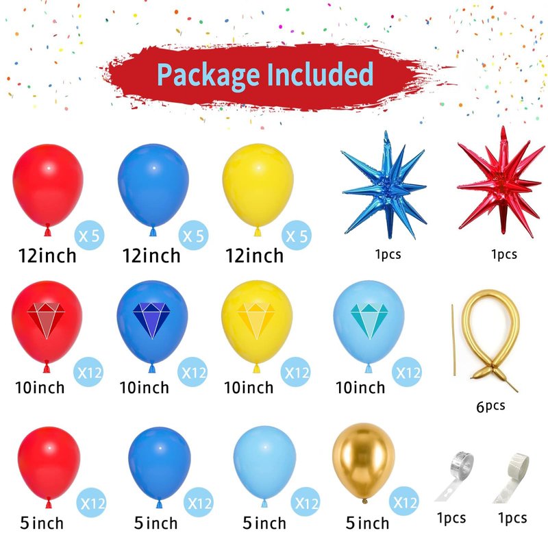 • 【Cartoon Hedgeho Theme Balloon Arch Kit】Total 121 pcs 15 latex balloons(12 in), 48 cute printing pattern latex balloons(10 in),48 latex balloons(5 in),6pcs long balloons,2pcs exploding star balloons,1pcs balloon strip,1pcs roll glue dots