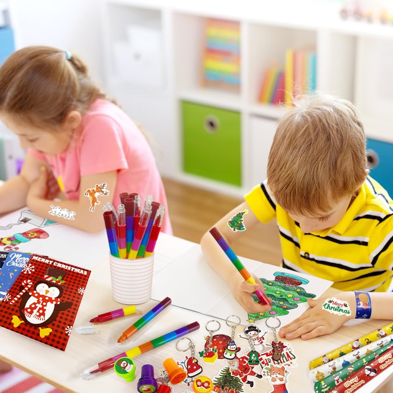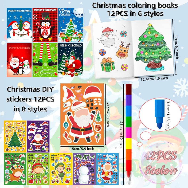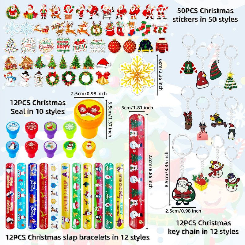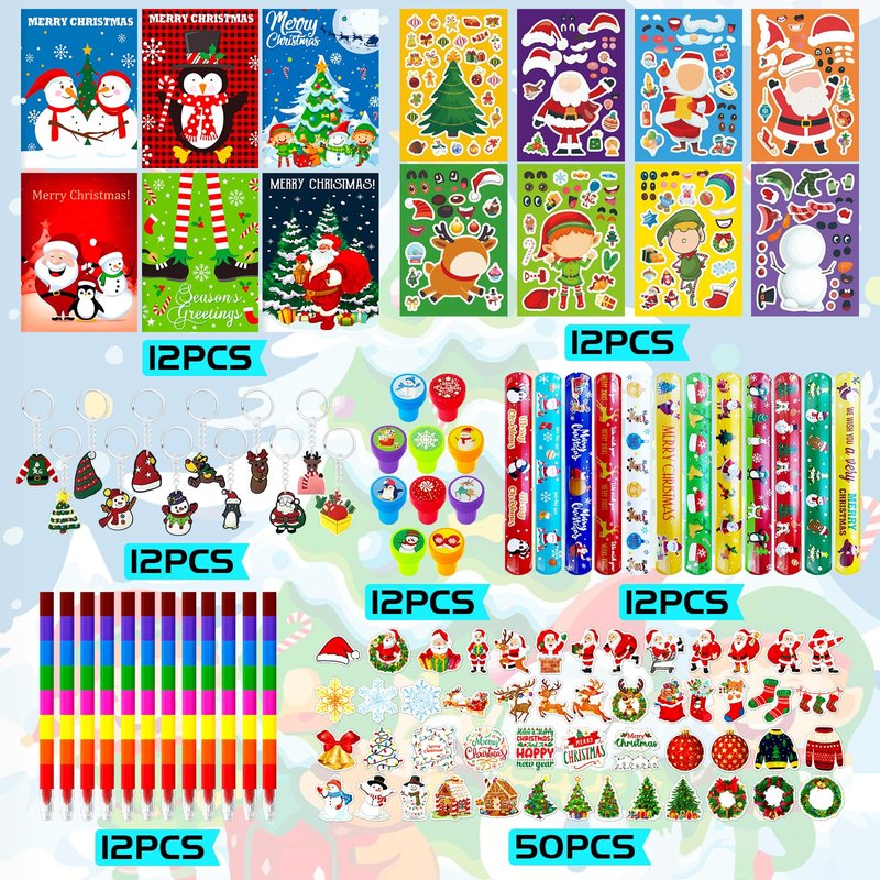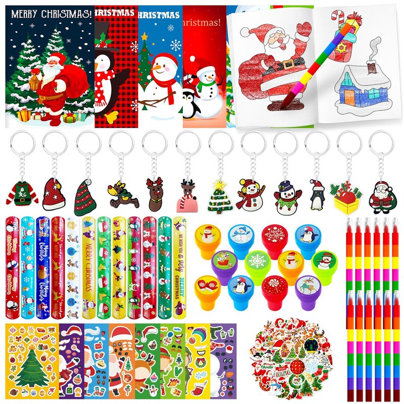 • Super Valued Christmas Party Favors for kids:12PCS Christmas Coloring Books;12PCS Eight Color Crayons;12PCS Christmas Keychains with 12 styles, 12PCS Christmas DIY Stickers;12PCS Christmas Stamps;50PCS Christmas Stickers;12PCS Christmas Slap Brecelet