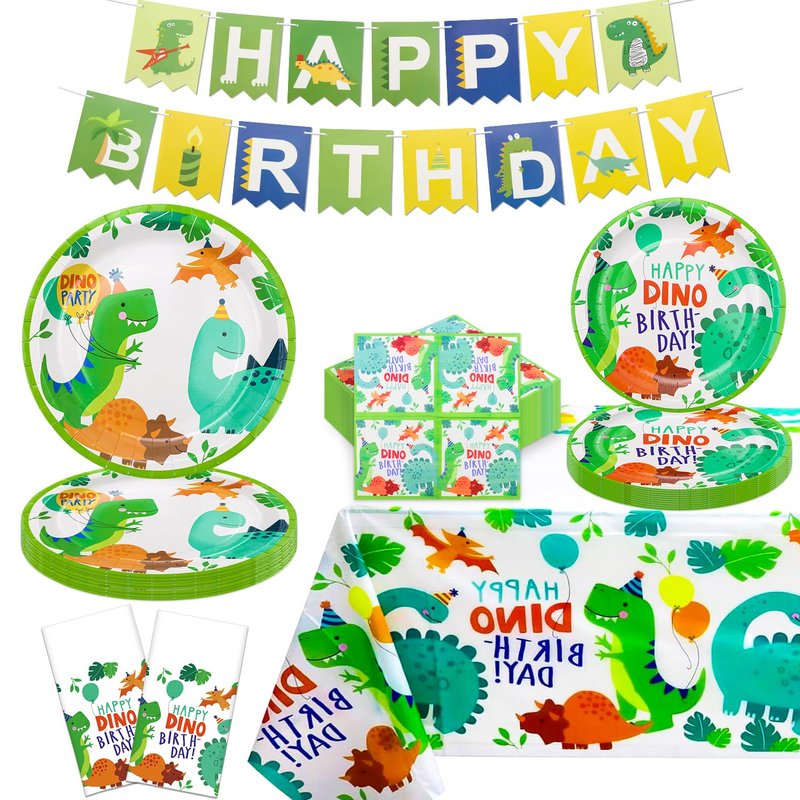 - Dinosaur Party Supplies Includes: 40 X 9” dinner plates, 40 X 7” dessert plates, 40 X Napkins, 2 X birthday table cover, 1 X HAPPY BIRTHDAY banner. You will receive 123 Pack for Dino birthday party decorations.