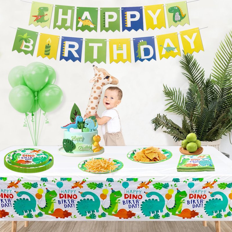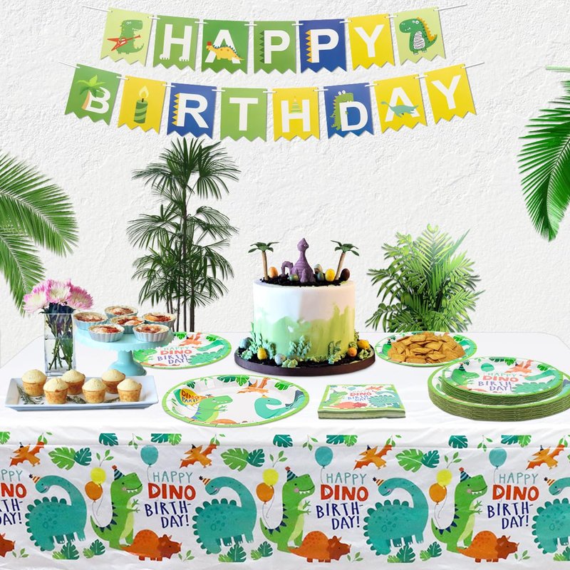 - Reliable Quality: The Dino theme happy paper plates and Banner are made from food-grade cardboard, thick and sturdy, non-toxic, no odd smell and environmentally friendly. The pattern and color are well-printed and fade-resistant.They are not easy to bend, fold or tear and strong enough to hold a full plate of food. The party table cloth is made of PE. Splash-proof and waterproof, lightweight and portable, non-toxic and reusable, them can prevent party table from being scratched.