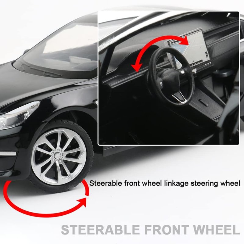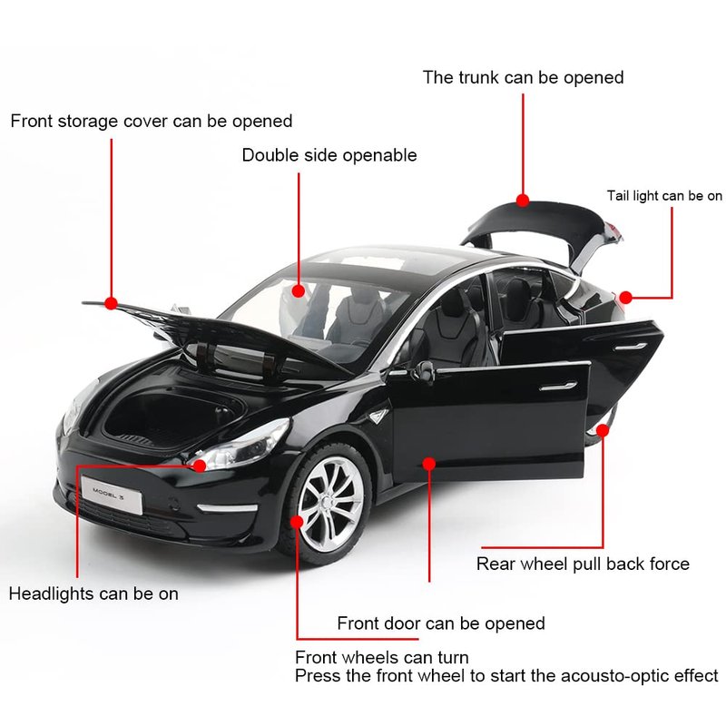 1/24 Diecast Model 3 Toy Car, Alloy Casting Model 3 Model Car Pull Back Collectible Vehicles with Sound and Light, 6 Open Doors, Model 3 Diecast Model Car Toy for Kids Adults (Black)