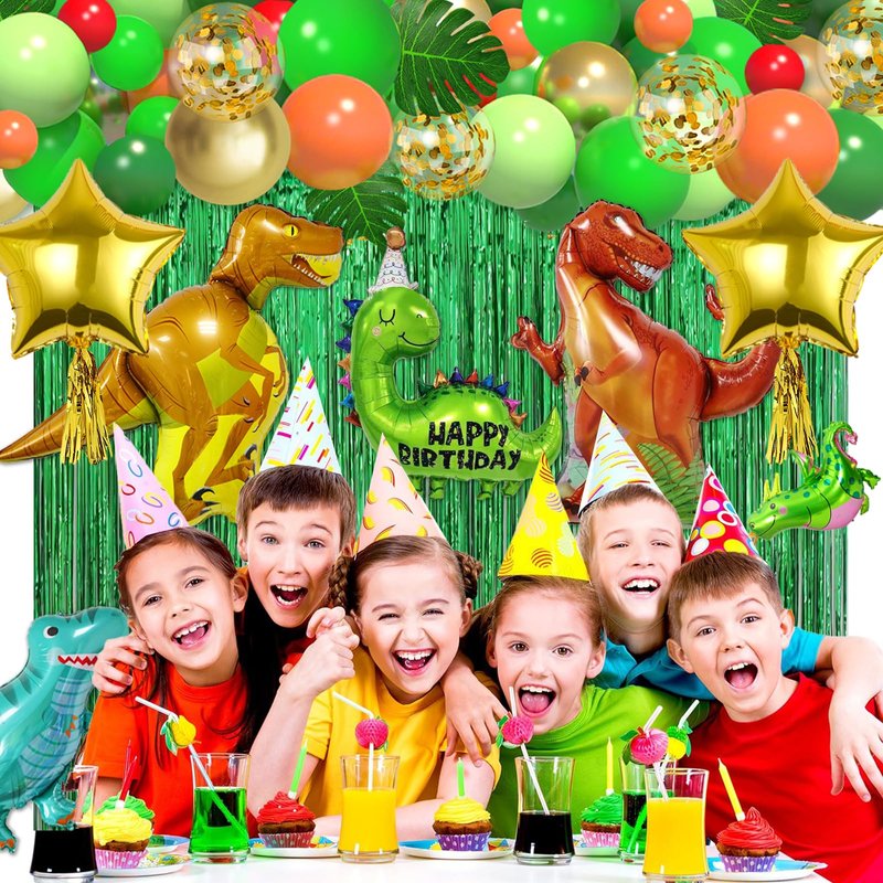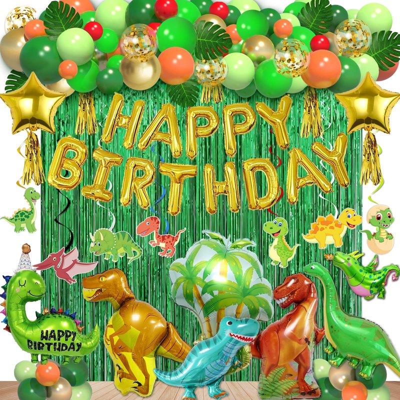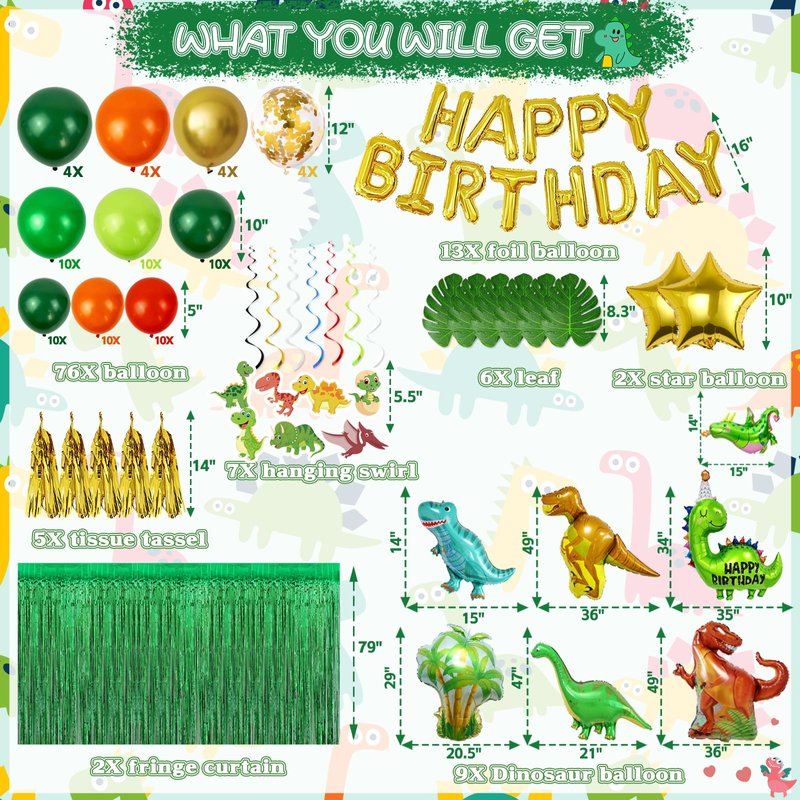 - Dinosaur Birthday Party Decorations Supplies: Dinosaur birthday decorations with 125pcs, include 80 latex balloons(gold, dark green, light green, fruit green, red, orange). 4 large sized dinosaur balloons, 5 small dinosaur balloons, 1 large sized coconut tree, 1 set birthday sign banner balloons, 2 green party rain curtains, 5 gold paper tassel, 2 star foil balloons, 6 simulated leaves, 14 pieces hanging ornaments, which are 7pcs card cuts with 7 different patterns and 7pcs whirls foil ceiling swirls streams, balloon tools: glue point (100 dots), ribbons, straw.