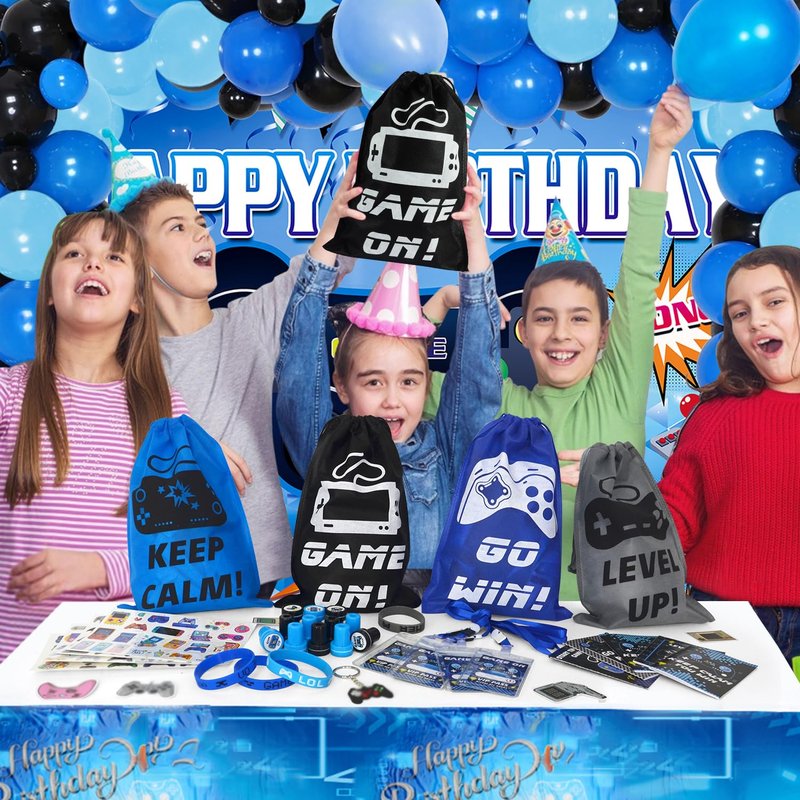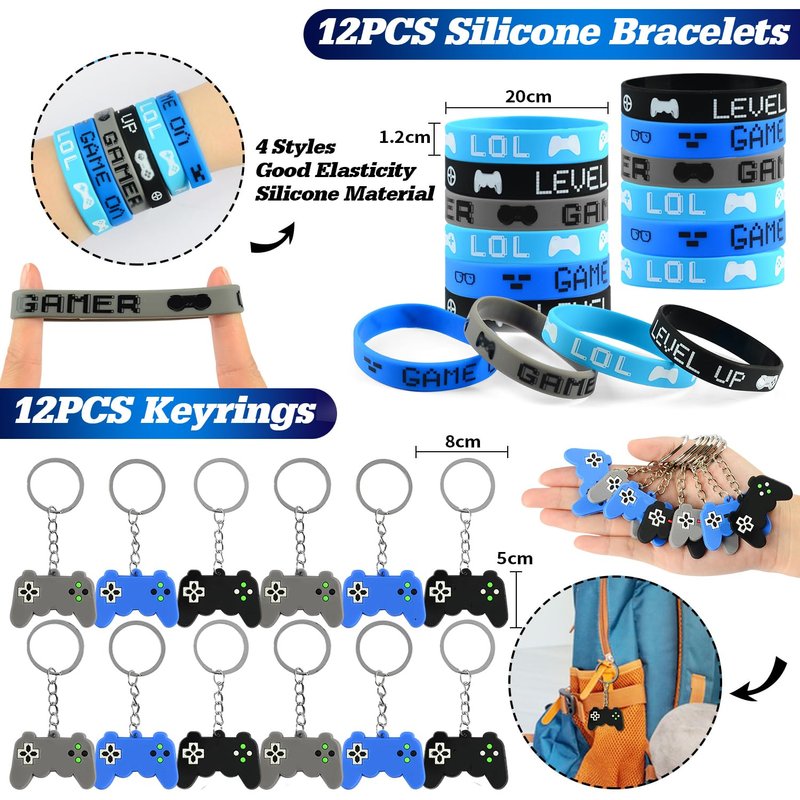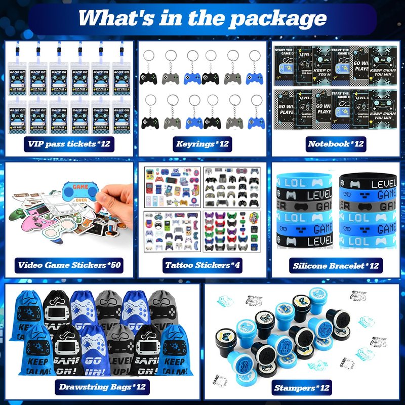 - Video Game Party Favors: 12 x VIP pass cards, 12 x drawstring bags, 12 x silicone bracelets, 12 x keychains, 12 x stampers, 12 x notebooks, 4 sheets of temporary tattoo stickers, 50 x video game stickers. Kids and adults will love this gaming party favors.