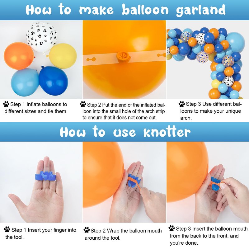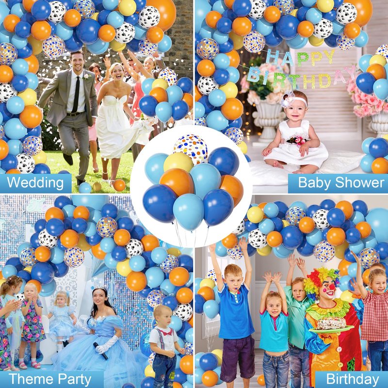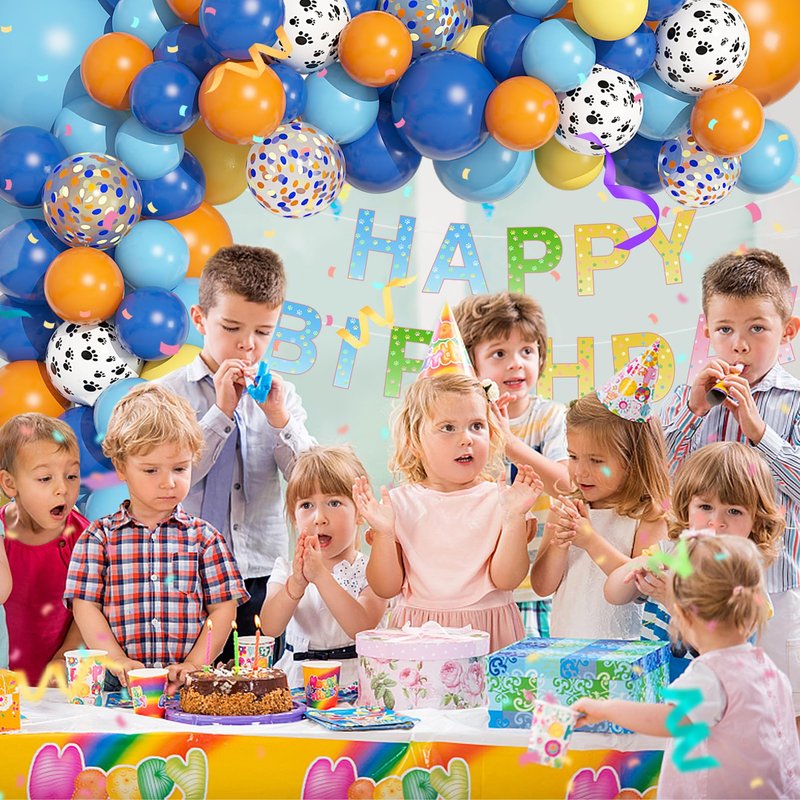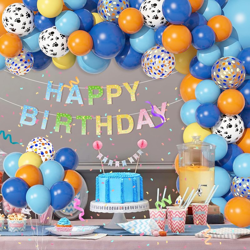 - Package Includes: The blue birthday party supplies includes 3pcs 18" dark blue/orange/light blue balloons, 25pcs 12" dark blue/orange/light blue/confetti/dog pow balloons, 36pcs 10" dark blue/orange/yellow/light blue balloons, 46pcs 5" dark blue/orange/yellow balloons latex balloons, a bone foil balloon, a HAPPY BIRTHDAY banner(13 letters) with 4 balloon tools. Super value!