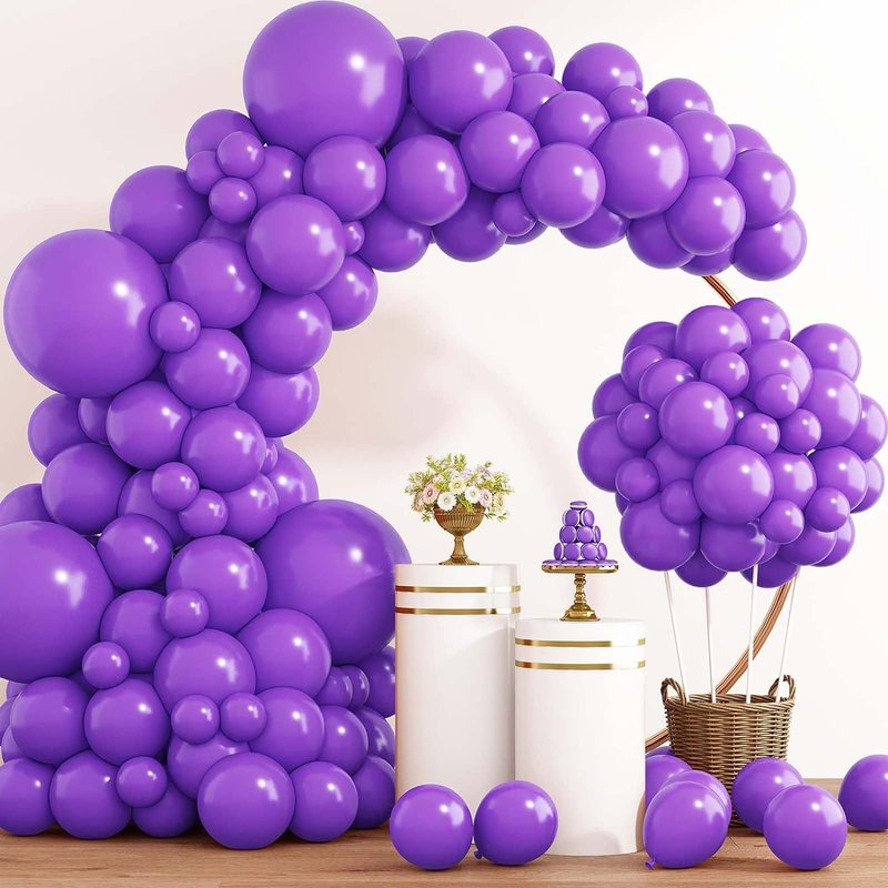 - 【Party Balloons Decorations Set】Our balloon decorations set includes 4PCS 18IN Purple Balloons,35PCS 12IN Purple Balloons,30PCS 10IN Purple Balloons,60PCS 5IN Purple Balloons,Two rolls of ribbon,7 PCS Double-sided tape. The sufficient number of baloon is enough for you to decorate a unique party and make any dull space full of vitality and joy.