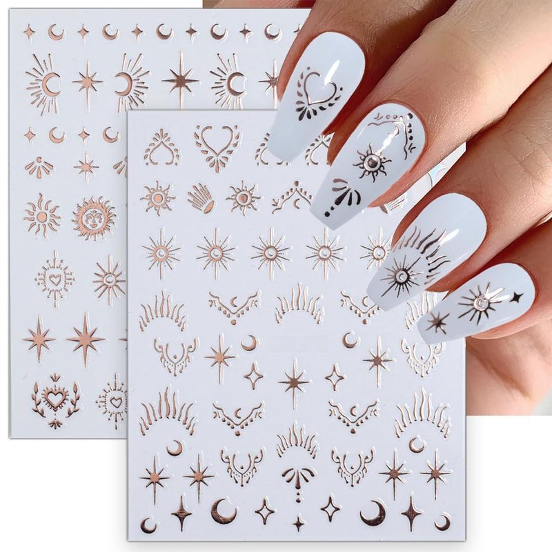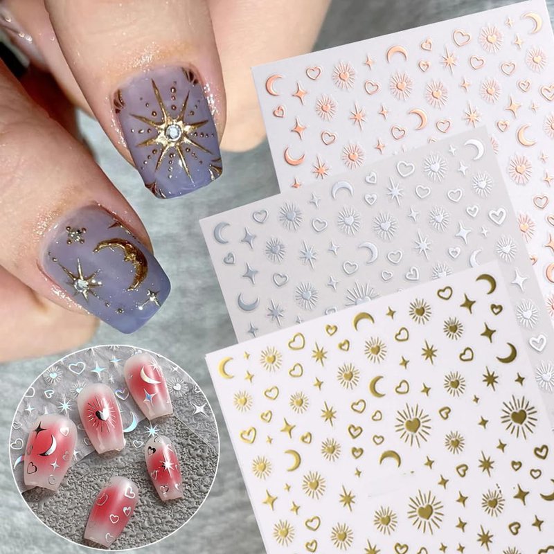 - √【Star Nail Stickers for Nail Art】Star and Moon nail sticker set features classic and timeless elements such as stars, moon, sun and love heart, ensuring that your nail designs will never go out of style and will be suitable for all seasons.