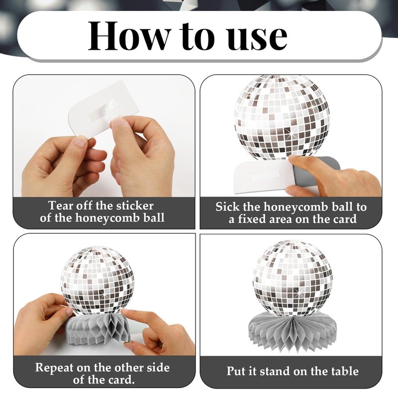 - How To Use: Our product is very easy to use, just tear off the sticker of the honeycomb ball,stick it on the fixed area of the card, repeat on the other side,and it's done.Disco 70s party table centerpieces easily to operate and clean can save you time and energy!