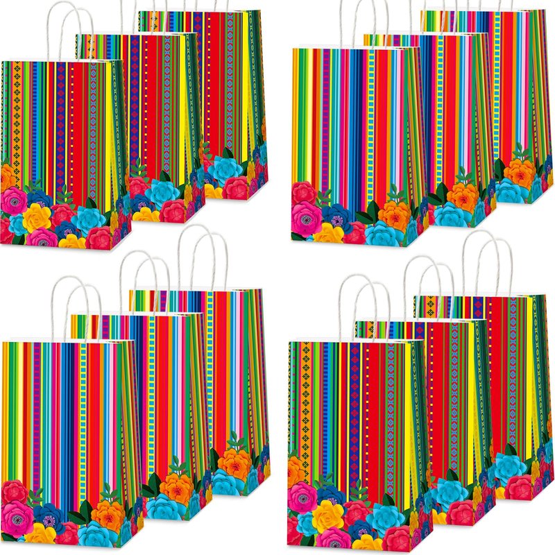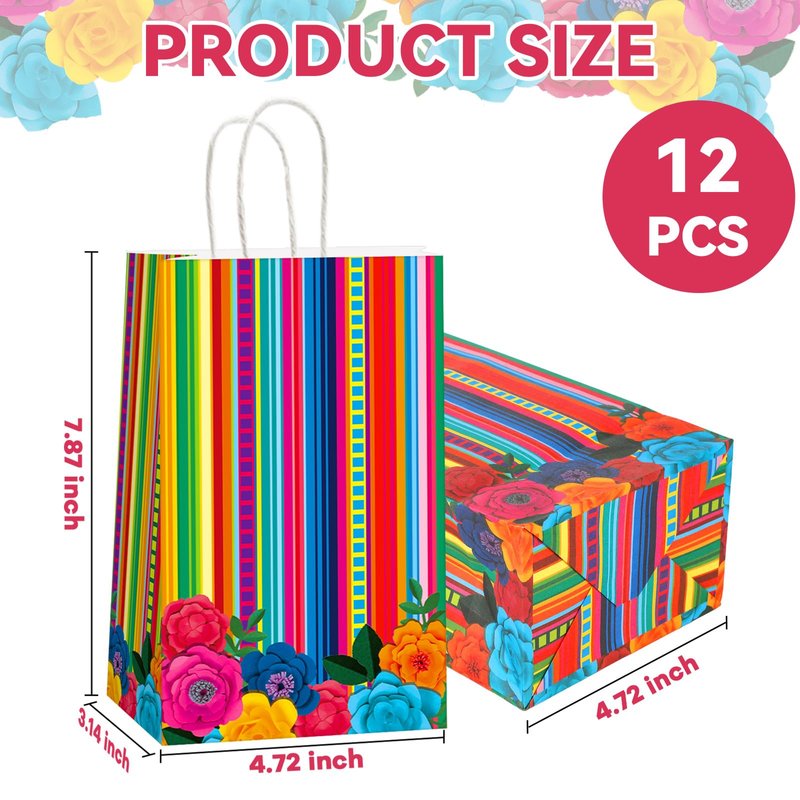 12pcs Mexican Fiesta Party Favor Bags Mexican Treat Bags Cinco De Mayo Candy Bag Floral Stripes Gift Goodie Bag for Flowers Birthday Party Taco Wedding Baby Shower Supplies Decorations 4.7*3.15*8inch