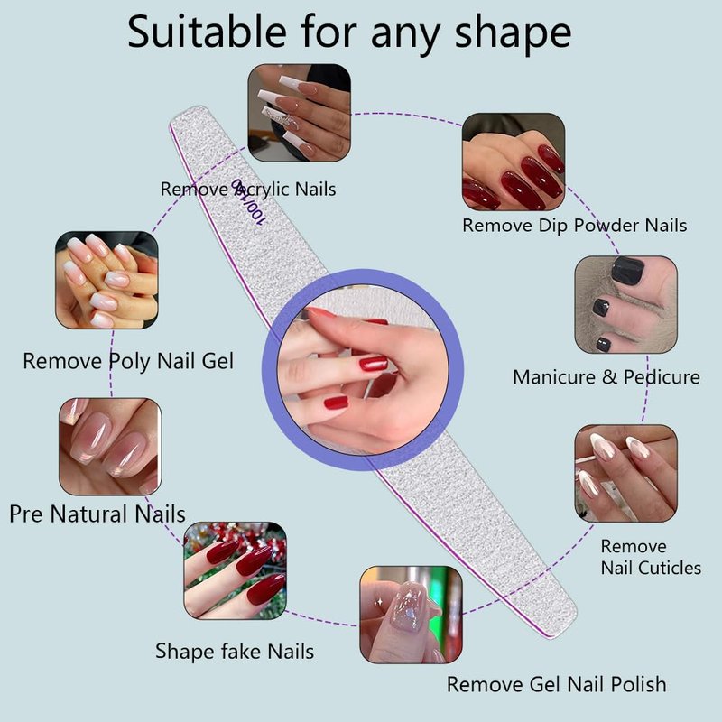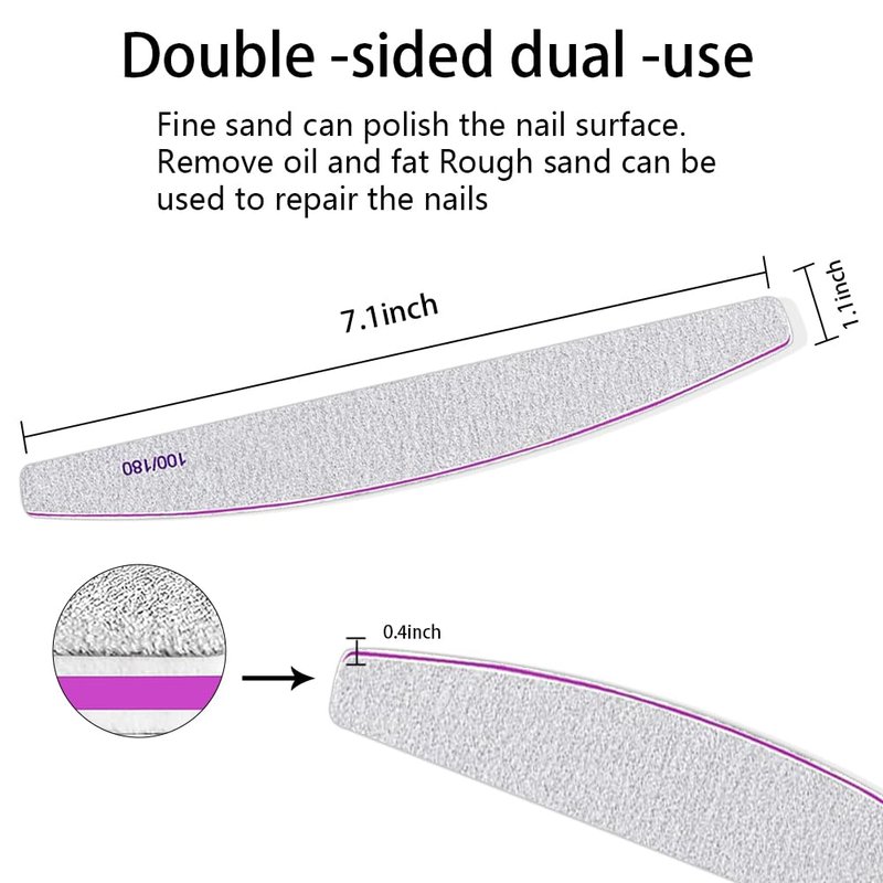 - 【Nail File Size】6.88x 1.96x 1.18inches, Half-moon shaped 100/180 grit nail files. Double Sided emery boards for nails - Rough up the hard fingernails and toe nails in 100 grit, and use 180 grit smooths up your nail edge with refined shape. Keep the nails beautiful all the time!