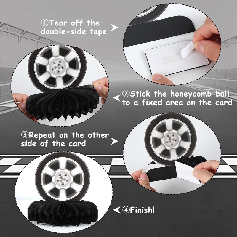 - Easy to assemble: You just need to peel off the double-sided tape, unfold this car race track party tabletop honeycomb base and paste them together, which can avoid from being fallen down or blown away, you'd better stick the bottom at the same time, making it stand more firmly.