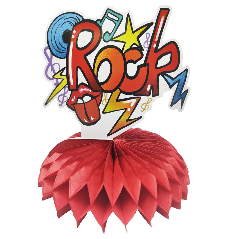 - These rock and roll themed honeycomb centerpieces are printed on both sides and made of cardboard. They're not easy to fade, so they'll look great at your party.